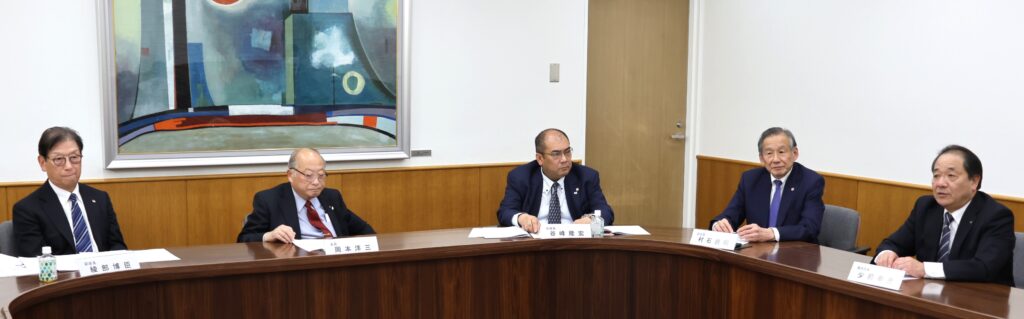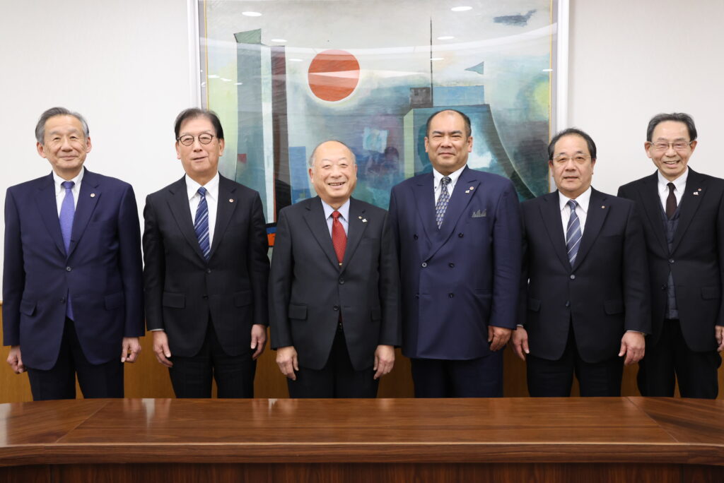 左から村石副会長、綾部副会長、岡本会長、谷峰副会長、少前専務理事、小島情報政策委員長